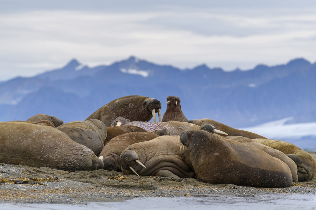 Walruses are very social, typically found in large shoreline herds or living together on moving pack ice. These are the areas we most often encounter walruses on our Svalbard voyages.