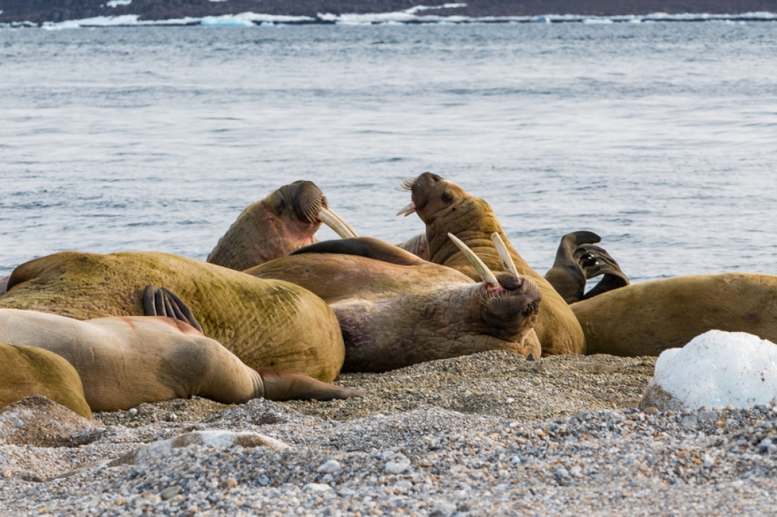 During the Arctic summer and autumn, walruses haul out in specific locations. Atlantic walruses like to haul out onto low, rocky shorelines with steep subtidal zones that provide them quick and easy access to feeding areas – as well as escape routes from predators.