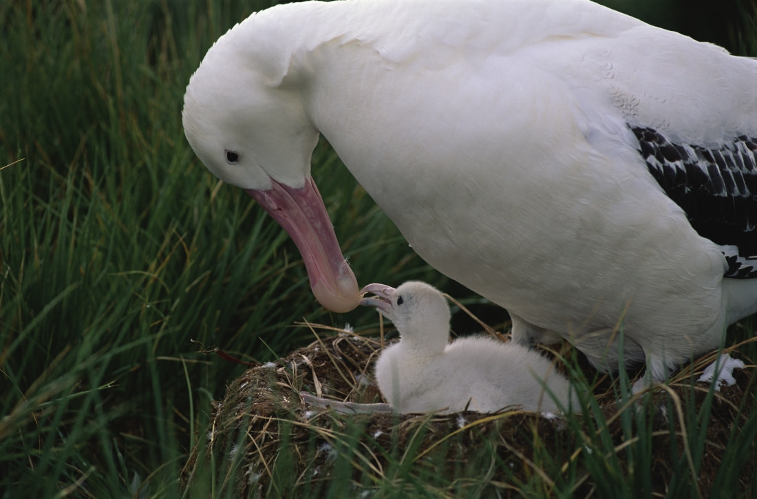 Females lay one egg between the middle of December and early January, after which incubation takes around 11 weeks. Once the wandering albatross chick is born, adults switch off between hunting and staying at the nest to care for the chick.