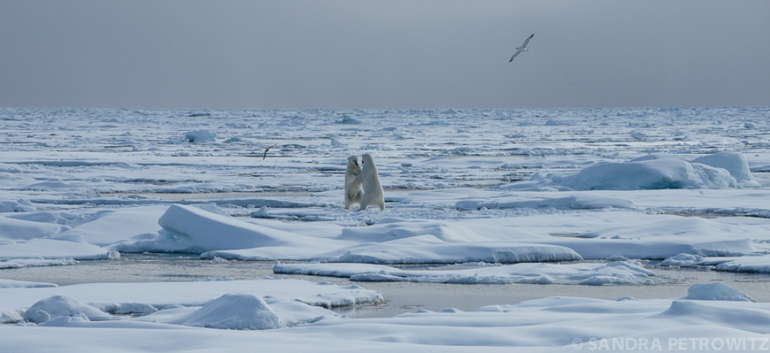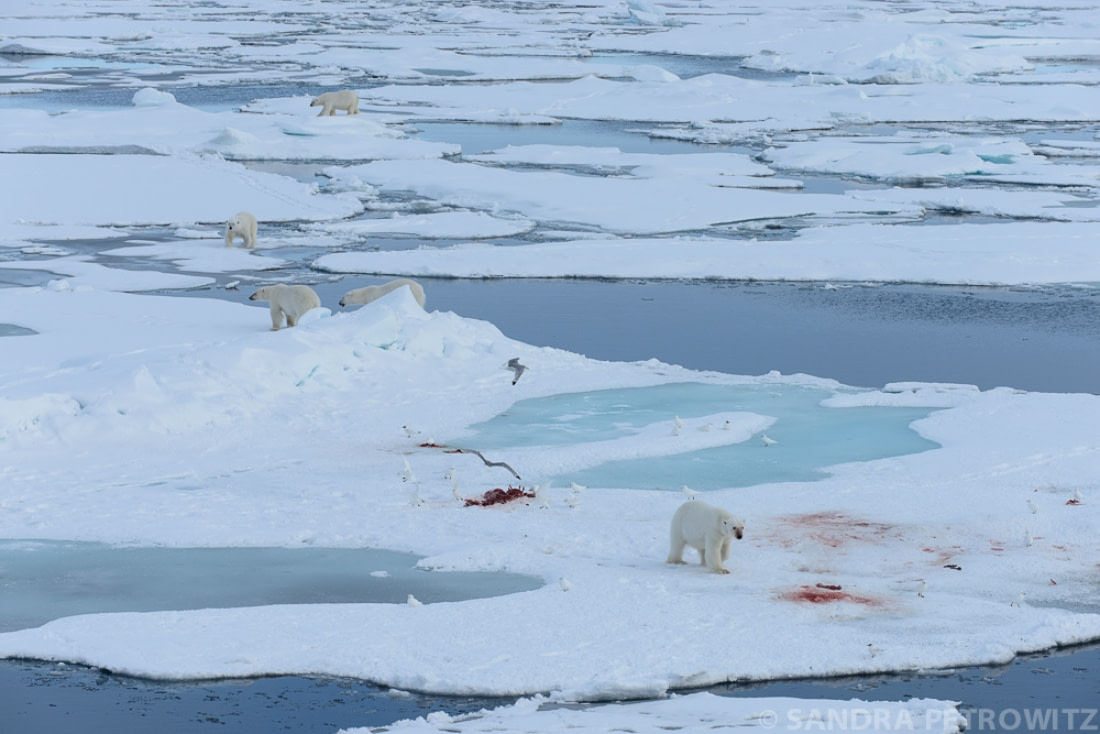 The fourth bear, an older male, had had enough of the youthful antics and retreated a few meters. Over 60 ivory gulls either sat on the ice, waiting patiently, or paced back and forth near the remains of what had once been a bearded seal.