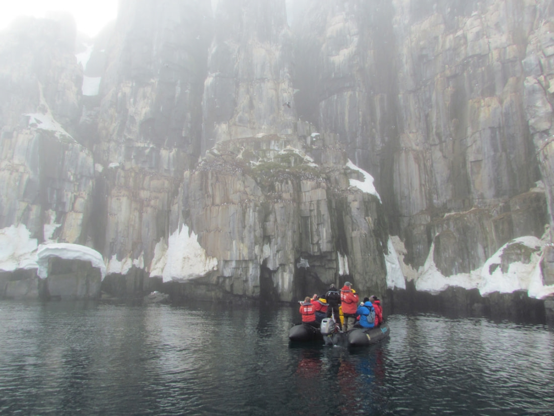 If they knew their way home, why not follow them? Equipped with GPS and compass, we approached the cliffs by zodiac. First, we heard the noise from the colony – the distinct calls of guillemots, kittiwakes, and Glaucous gulls. Then the cliffs gradually emerged from the mist.
