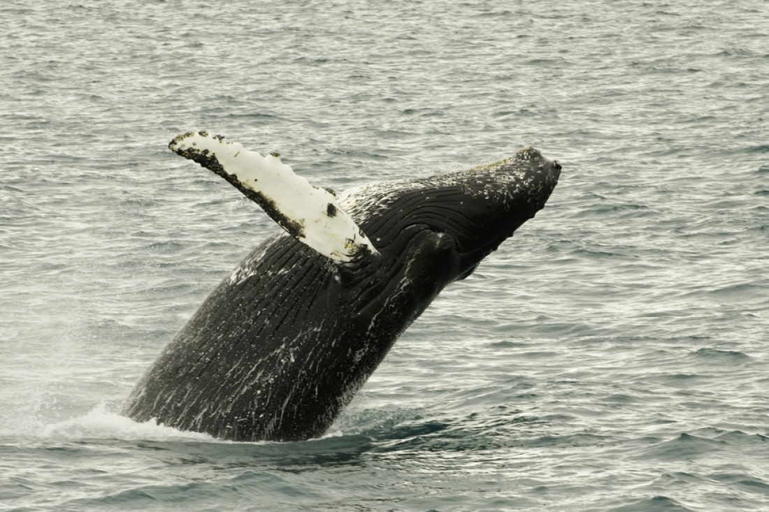 Known for the way it humps its back before a dive, the humpback whale is often first noticed by its spout, which can reach as high as 6 meters (20 feet) and be heard as far as 245 meters (800 feet) away.