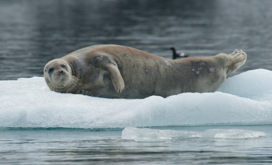 The largest seal species in the Arctic, the bearded seal is known for its long whiskers and loud voice. The song of the male bearded seal can be heard up to 20 km (12.4 miles) away.
