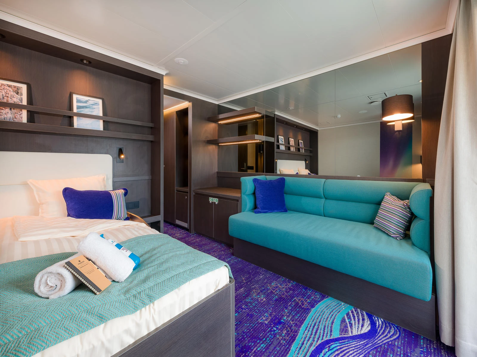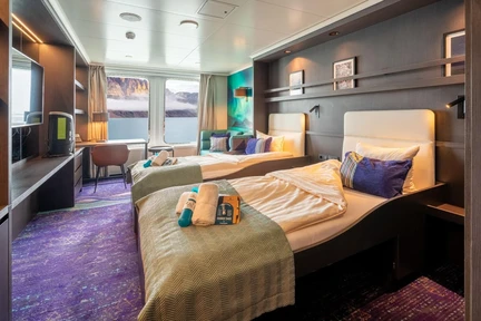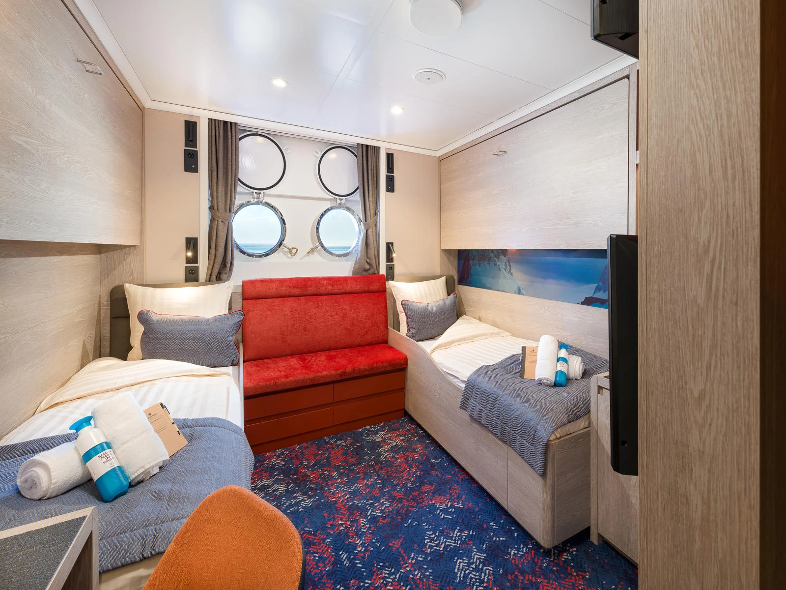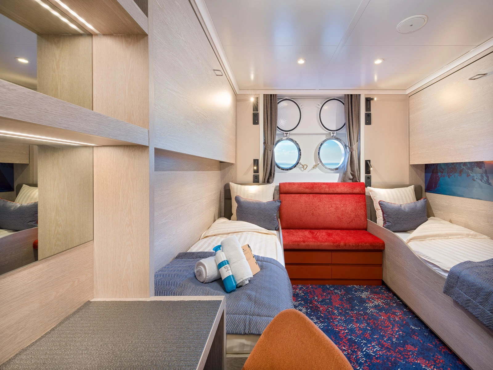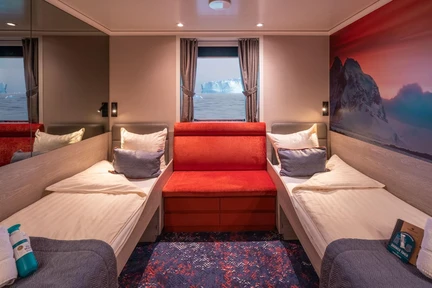 The best view is always on the outer deck or the bridge. Hondius offers high-quality accommodation for 170 passengers in six grand suites with balconies (27 square meters, 291 square feet), eight junior suites (19 to 20 square meters, 205 to 215 square feet), eight superior cabins (20 to 21 square meters, 215 to 226 square feet), 11 twin deluxe cabins, (19 to 21 square meters, 205 to 226 square feet), 14 twin window cabins (12 to 14 square meters, 129 to 151 square feet) as well as 27 twin porthole cabins, two triple porthole cabins, and four quadruple porthole cabins that vary in size from 12 to 18 square meters, or 129 to 194 square feet.