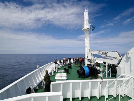 En route to South Georgia, you now cross the Antarctic Convergence. The temperature cools considerably within the space of a few hours, and nutritious water rises to the surface of the sea due to colliding water columns. This phenomenon attracts a multitude of seabirds near the ship, including several species of albatross, shearwaters, petrels, prions, and skuas.