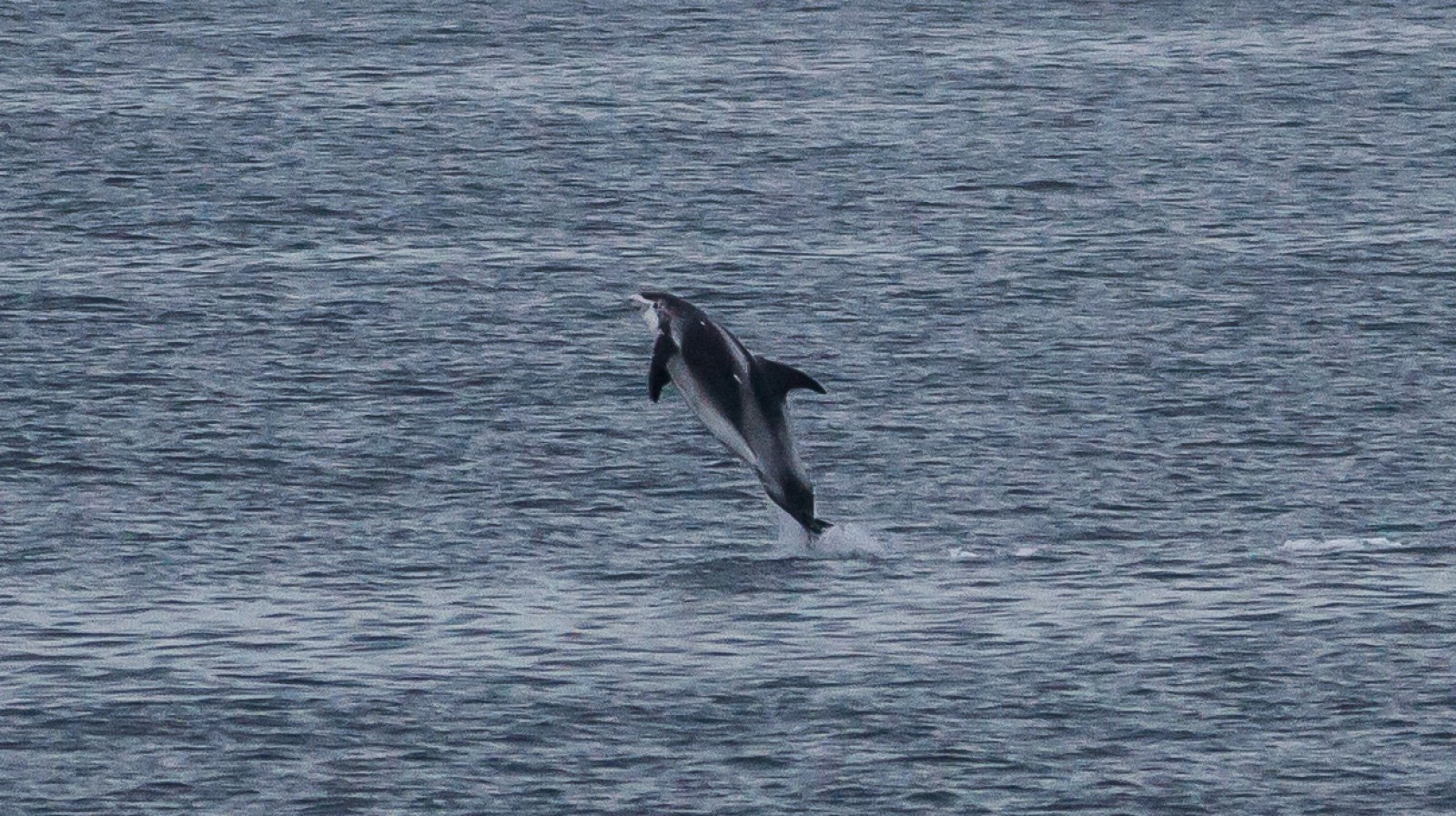 Appearance: Short, white beak. Curved dorsal fin. The body is dark gray or black, with white patches, and white or light-colored bands down the flanks.