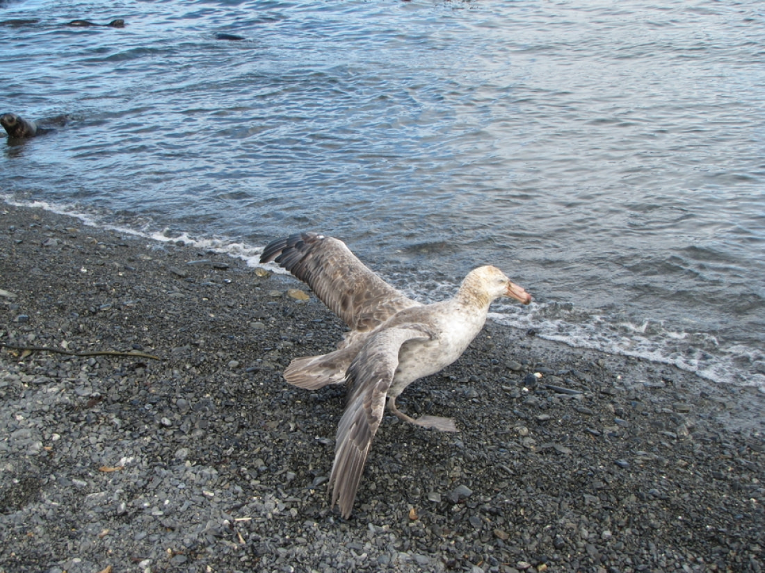 The giant petrel can often be seen awkwardly moving along the beaches of King George Island, as if it has just learned to walk. More frequently, though, it is observed gliding through the air on its impressive wingspan of 180 to 210 cm (71 to 83 inches).