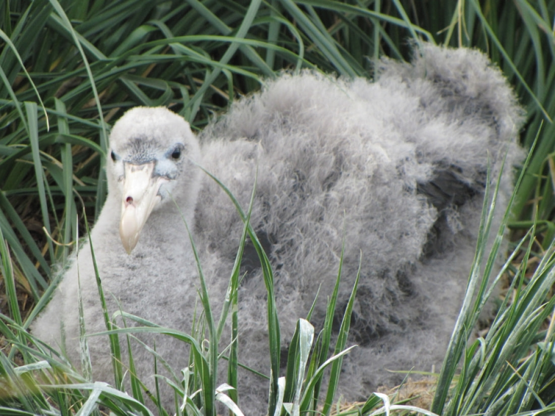 For conservation purposes, scientists must continue to study giant petrel chicks. Researchers fit the young birds with a metal band around their leg, with a number corresponding to the year they were banded.