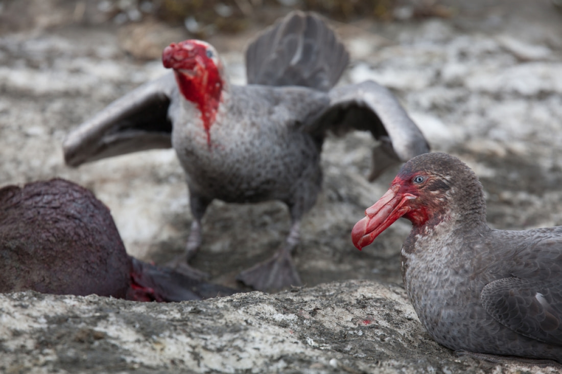Feeding is a round-the-clock task that involves catching fish at sea, scavenging for dead seals along the beaches, and searching penguin colonies for unattended eggs or chicks. Giant petrel chicks enjoy some of the best dining in Antarctica.