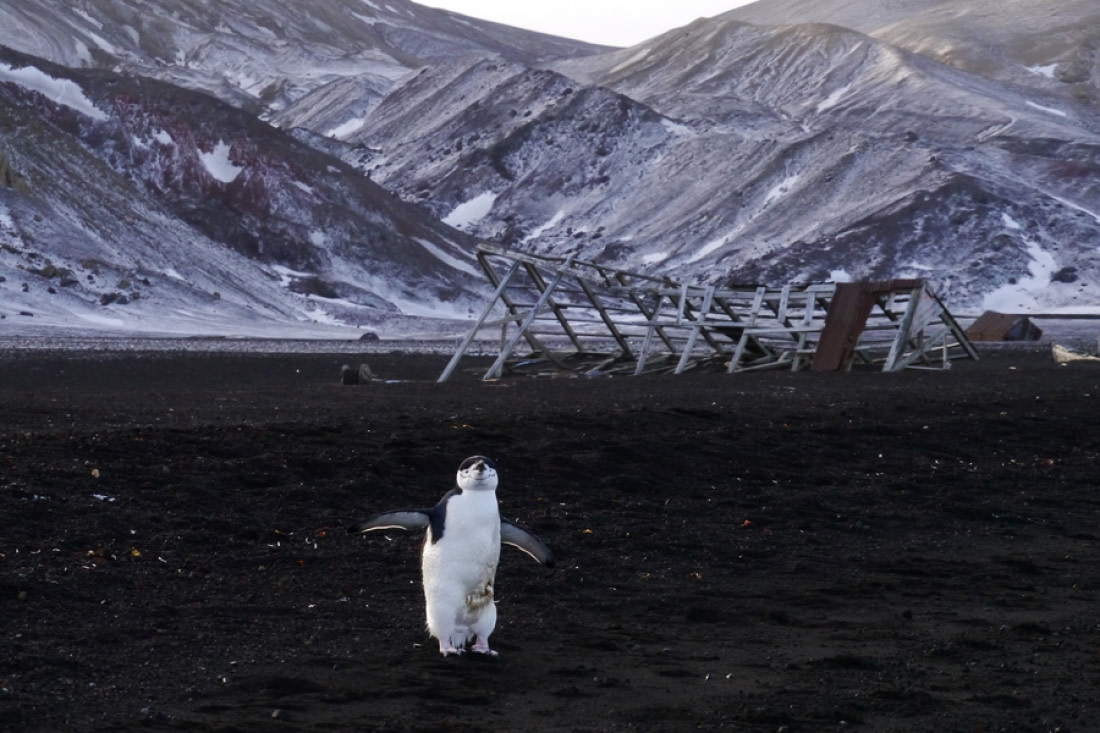4. Seekor penguin chinstrap berpose di Whalers Bay
