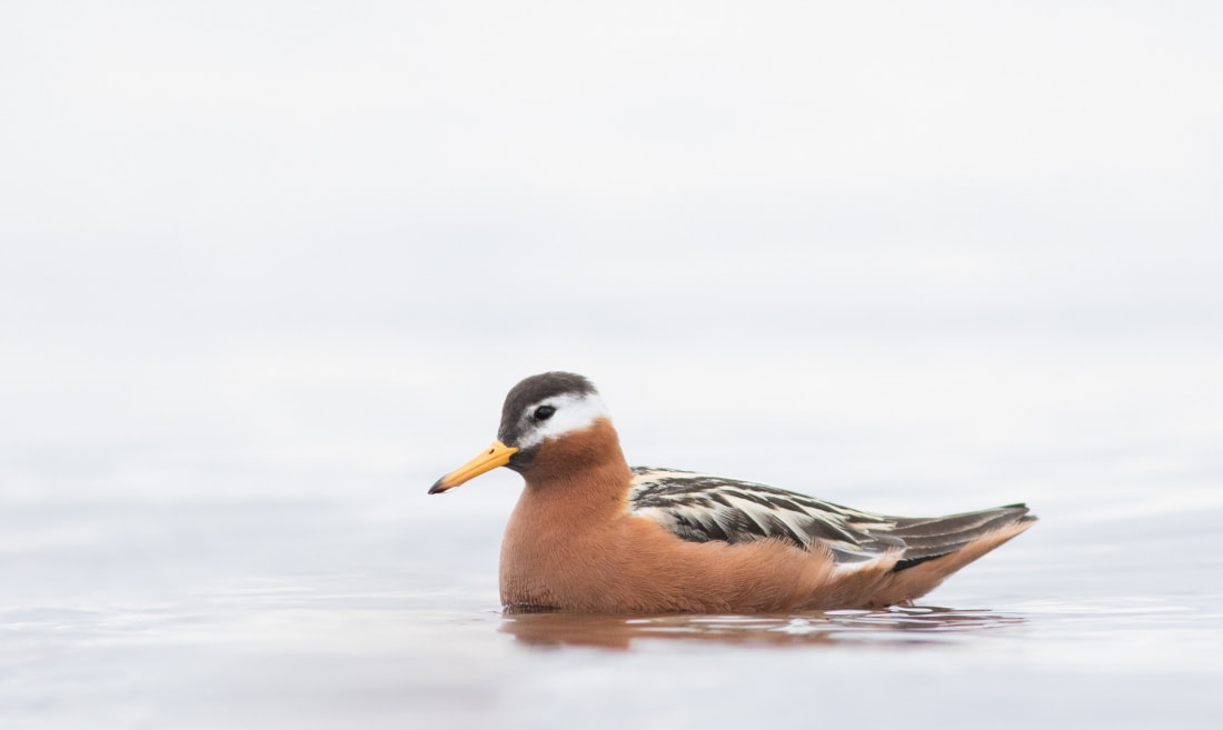 Grey Phalaropes forage in shallow waters, creating small whirlpools by swimming in circles to bring insects and crustaceans to the surface for easy capture.