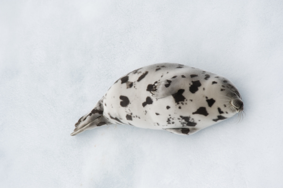 Appearance: Harp seals change appearance throughout life. Newborns have a white fluffy coat, adolescents have a silver-gray coat with black spots, and adults have distinctive black harp-shaped markings.