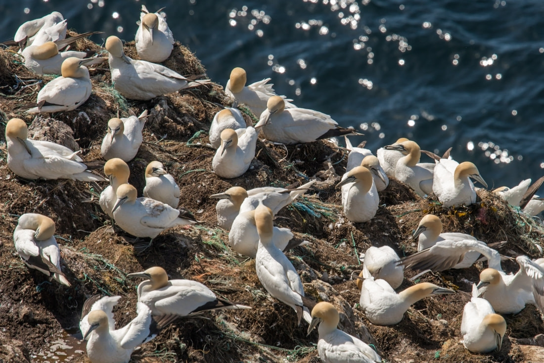 Northern Gannets return to the same breeding sites for hundreds of years, with colonies containing tens of thousands of nests. Older birds return first, with breeding seasons varying by location. They reach sexual maturity around four years of age. Juveniles may nest at the fringes or take over other nests but will yield to older birds. Males build nests from seaweed and other materials, requiring maintenance throughout the season. Same-sex fights can occur, especially among males.